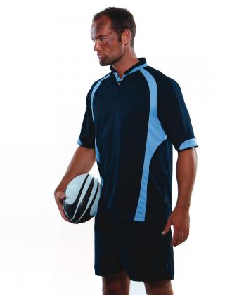 100% polyester with moisture management Raglan sleeves Soft fused stand up collar One button placket Contrast tape around outer neck Contrast panels running down raglans and side front