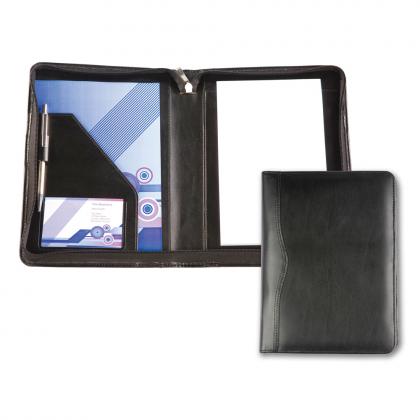 Black Balmoral Leather A5 Zipped Conference Folder with a lightly padded and stitched cover, finished in a Balmoral bonded leather formed from recycled leather waste bonded to form a soft material with an excellent emboss quality and a smooth grain. Supplied boxed. Product features include Black Interior Pockets, Angled Pockets for Notes, Business Card Holder, Pen Loop, Fitted Lined Pad, Zip to close, Supplied boxed.